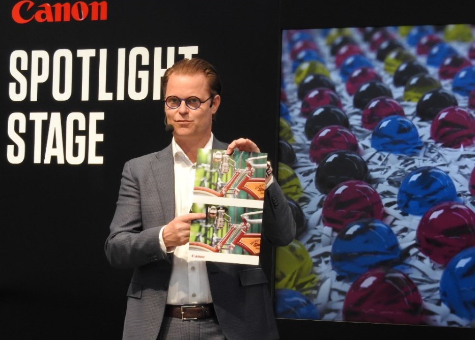 Een van tevoren niet aangekondigde innovatie op de stand van Canon was een nieuwe finishing technologie op de Océ Colorado, de twee jaar geleden geïntroduceerde UV Gel-printer. De nieuwe 1650, aanvullend op de 1640, kan een veelheid aan media aan, werkt met een meer flexibele en elastische inkt en biedt een bijzondere nabewerking, de Océ FLXfinish technology. Peeters (foto) -die op de stand elk uur vijf minuten het podium pakte- vertelde over de nieuwe ontwikkeling onder meer dat productiehuizen dankzij deze innovaties de eindproducten op divers materiaal nu ook twee extreme uitstralingen kunnen meegeven: een hele matte en een zeer glossy uitstraling.