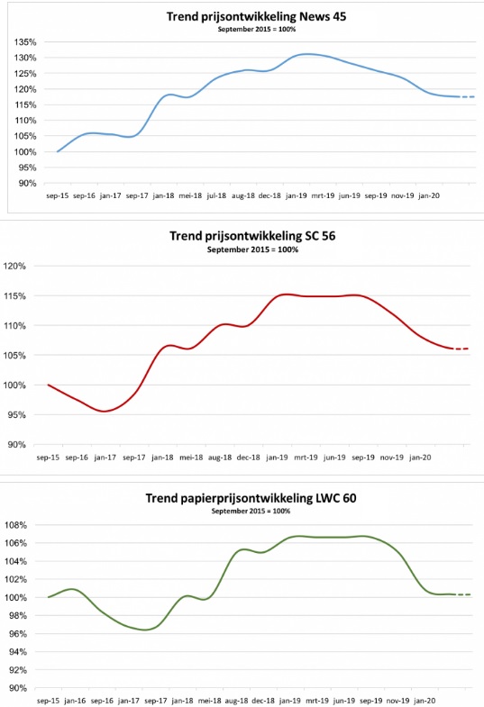 De LWC-kwaliteiten laten een daling zien van circa 12%. Ook hier wordt de diepdruk zwaarder geraakt dan in de offset. Wederom speelt het faillissement van Roto Smeets daarbij een rol. Ook de houtvrije kwaliteiten lopen in volumes terug: 8% tot 10%. Deze stagneringen hebben zich eind 2019/begin 2020 vertaald in prijsdruk. Onderhandelingen zijn eind 2019 gestart met een duidelijke koers: prijsdalingen.